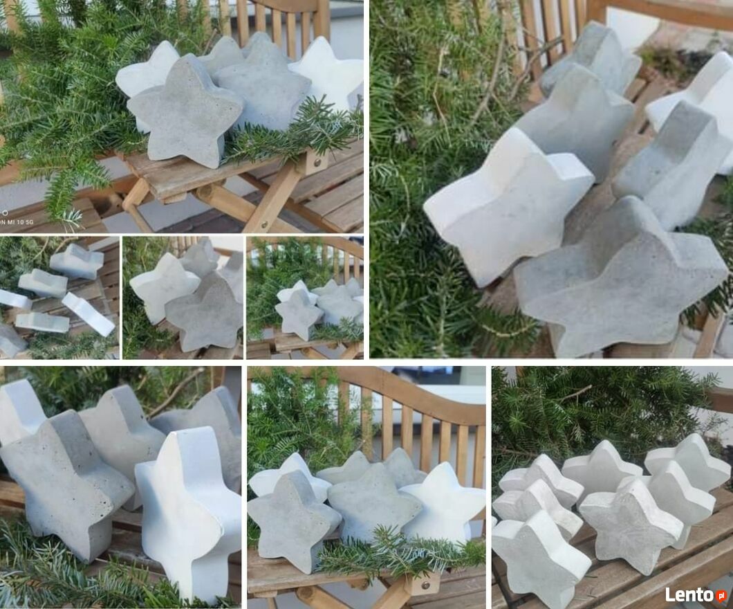 Moje gwiazdki ozdobne, wykonane z białego cementu lub szarego cementu z dodatkiem włókna. Wymiary 15 cm/15 cm.Cennik: